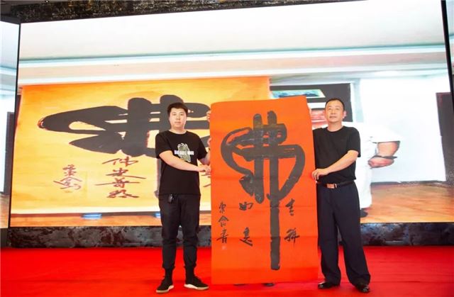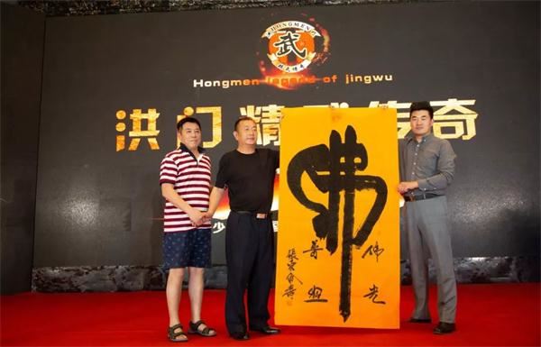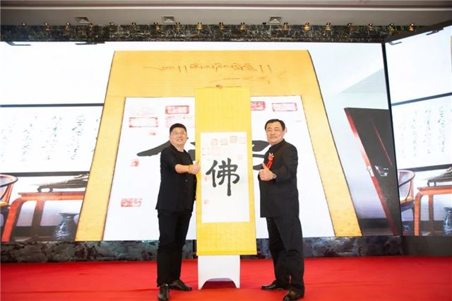 山东言鼎控股集团董事长刘元柱先生(左一)以10万元人民币拍得许刚先生(右一)书法作品《佛》,善款用于助力洪门精武传奇,用实际行动支持民族运动的发展。