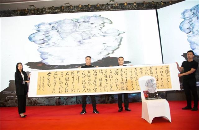 上海展晟信息科技有限公司董事长孙策(右一)高价拍得毛泽东特型演员古小月(左一)书法作品《海纳百川》,助力洪门精武传奇,用实际行动支持民族运动的发展。