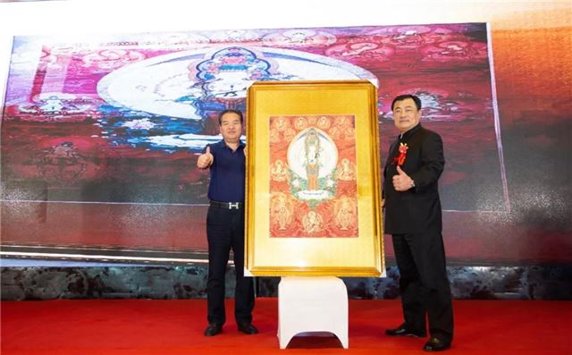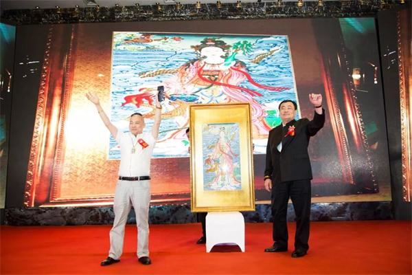 青岛浩大集团董事长徐滕明先生(左一)高价拍得许刚先生(右一)珍藏艺术品——著名唐卡画师多杰旦才作品,助力洪门精武传奇,用实际行动支持民族运动的发展。