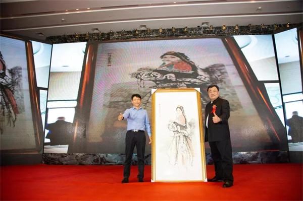 山东大陆置业有限公司董事长冯明先生(左一)高价拍得许刚先生(右一)珍藏艺术品——著名画家赵建成先生关门弟子巨然先生作品,助力洪门精武传奇,用实际行动支持民族运动的发展。