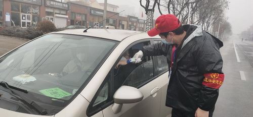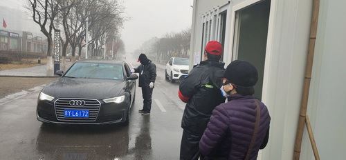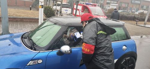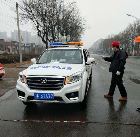 走访期间分别见到警务部门、城管部门车辆经过,志愿者也是逐一检查出入证、测体温、消毒才放行。