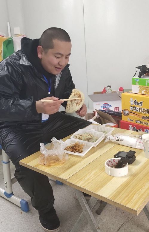 志愿者周兵说:我从1月30日就来到这个防控点,开始是晚班,前几天调到白班,为了不耽误工作中午吃方便面,今天有饼可以吃幸福……