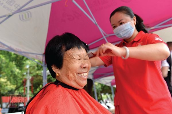 图为5月20日,爱心公益周活动启动仪式后,现场爱心理发深受广大群众欢迎。