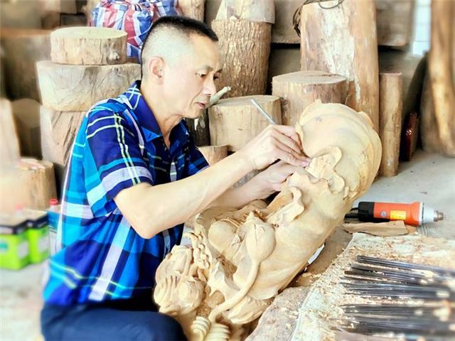 图:国家级高级工艺美术师黄忠聘在工作室创作作品