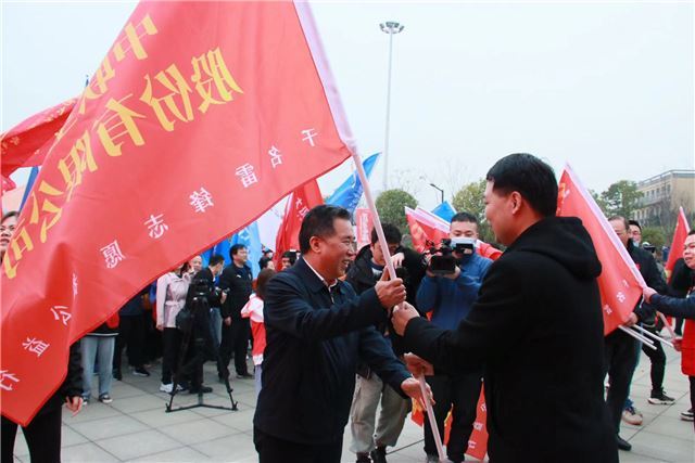 湖南省委宣传部副部长、省文明办主任肖凌之,湖南省体育局党组成员、副局长罗跃龙,湖南广播影视集团有限公司党委委员、副总经理、副台长冯锦为省君子文化研究会、湖南省妇女儿童发展基金新君子文化基金、湖南满缘红水科技有限公司、大汉集团等38家单位授旗,号召广大志愿服务组织和志愿者传承弘扬雷锋精神,为文明典范城市奉献文明力量。