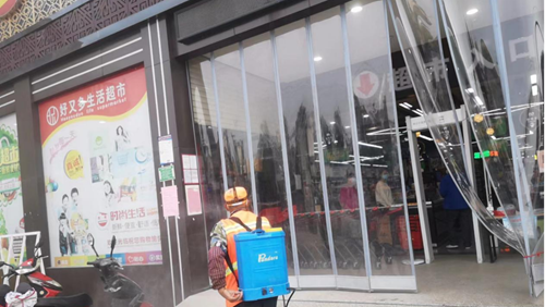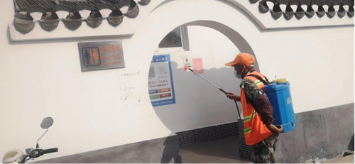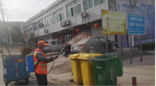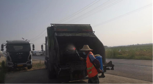 (图为环卫工人每天早晨六点就开始对环卫作业车辆、域区垃圾桶、超市进出口、公厕等重点区域进行日常消杀作业。)