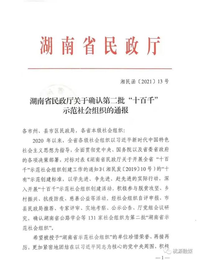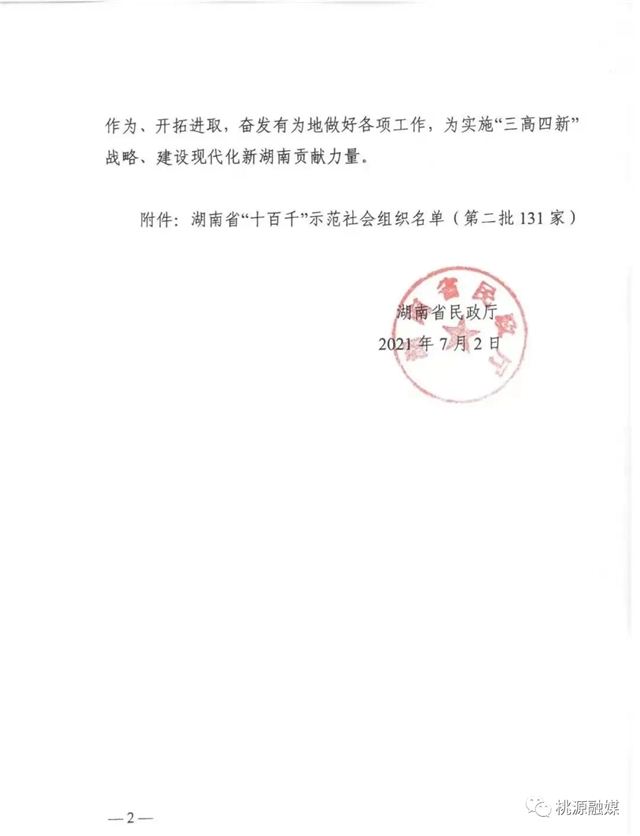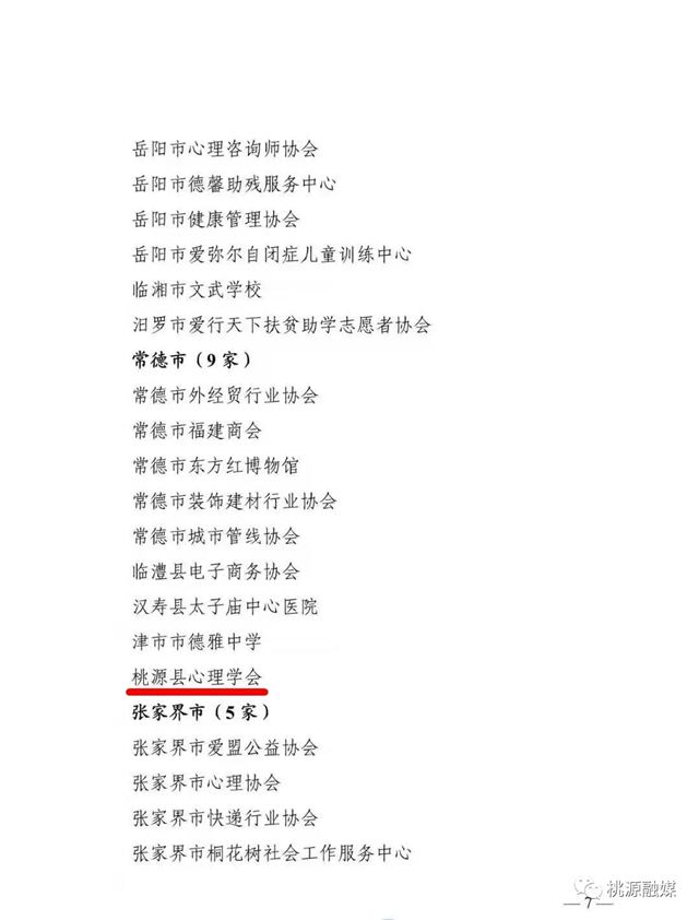 7月9日,从湖南省民政厅传来消息,常德市外经贸行业协会、市福建商会、市东方红博物馆、市装饰建材行业协会、市城市管线协会、临澧县电子商务协会、汉寿县太子庙中心医院、津市市德雅中学、桃源县心理学会等9家社会组织被评为全省第二批“十百千”示范社会组织。