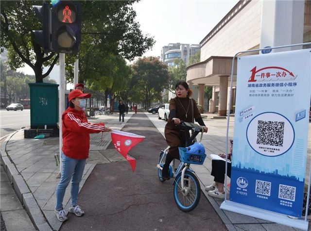 ▲为行人发放湖南省政务服务微信小程序宣传单