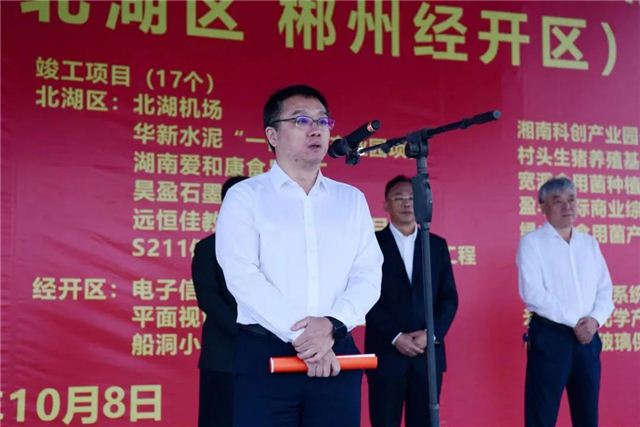 10月8日,2021年郴州市第三次重大项目集中开竣工(市城区二分会场)活动仪式在北湖区举行。市委常委、副市长马天毅宣布项目开竣工,区委书记、郴州经开区党委书记罗成辉致辞,区委副书记、代区长,郴州经开区党委副书记、管委会第一主任蒋慧亮主持,北湖区领导邓国光、阿曼·买买提、吴代友、黄晨峰、张强、潘麒任、曹行平、李振华,郴州经开区领导吴文明等参加。