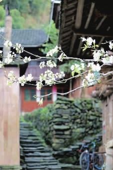 奉嘎山下团村,伸出墙外的花枝与青石台阶、古屋屋檐组成了一处唯美的秘境。