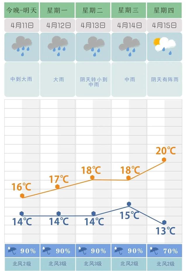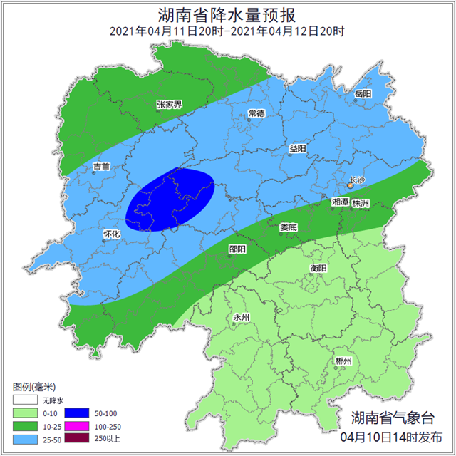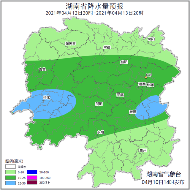4月11日20时至4月12日20时,阴天有小到中等阵雨或雷阵雨,湘中以北部分大雨,其中怀化中部、娄底西部、益阳西部局地暴雨;北风2~3级;最高气温湘东南22~24℃,其他地区18~20℃;最低气温13~15℃。