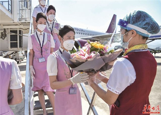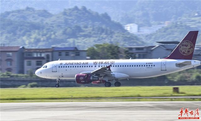 8月30日9时16分,张家界荷花国际机场,从浙江杭州飞来的首个进港航班吉祥航空HO1819平稳落地,经停50分钟后,出港飞往昆明,标志着张家界荷花国际机场正式复航。受此轮疫情影响,该机场自7月31日起停航。邵颖 摄