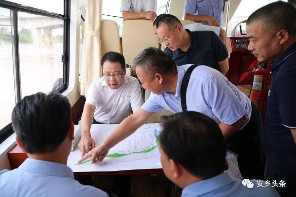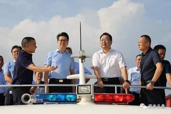 陈德自渔政码头出发,乘船自北向南对安乡县境内的松滋东支、松虎洪道、澧水洪道等河道进行巡查。途中,陈德详细了解河道管理、保护和治理情况,重点督查河道水质和周边环境状况,并听取了安乡县8月份河湖长制工作情况汇报。