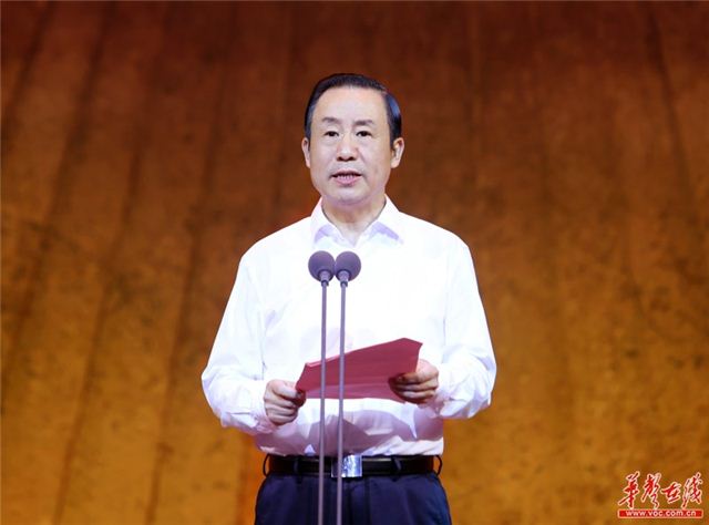 许达哲在致辞中代表省委、省人大常委会、省政府、省政协、省军区,向全省广大党员、干部和各族各界群众致以诚挚问候。他说,党的历史是中国近现代史最为可歌可泣的篇章。总书记指出,我们党的一百年是矢志践行初心使命的一百年,是筚路蓝缕奠基立业的一百年,是创造辉煌开辟未来的一百年。湖南是中国革命的重要策源地、是新时代我国精准扶贫的首倡地,三湘四水激荡英雄壮歌,锦绣潇湘深植红色基因。百年来,湖南这片热土镌刻着一代代共产党人不懈奋斗的足迹,走出了毛泽东、刘少奇、任弼时、彭德怀、贺龙、罗荣桓等无产阶级革命家,涌现了一大批视死如归的革命烈士、一大批顽强拼搏的功勋人物、一大批忘我奋斗的先进模范,造就了“十步之内、必有芳草”的红色景观。百年来,英雄的三湘人民在党的领导下,走过“为有牺牲多壮志,敢教日月换新天”的革命岁月,掀起“喜看稻菽千重浪,遍地英雄下夕烟”的建设热潮,闯出“洞庭波涌连天雪,长岛人歌动地诗”的改革之路,谱写“装点此关山,今朝更好看”的崭新篇章,不断把湖南各项事业推向前进。百年来,湖南都是孕育伟大精神的热土、彰显革命传统的高地,无论是革命时期形成的井冈山精神、长征精神、抗战精神等,还是新中国成立后形成的抗美援朝精神、载人航天精神、抗疫精神、脱贫攻坚精神等,无一不饱含着湘籍革命家和共产党人在这片热土上的牺牲与奉献。熔铸在百年党史中的湖南红色基因,早已伴随奔腾不息的湘江水深深融入湖湘儿女的精神血脉,成为激励我们砥砺前行的不竭动力。