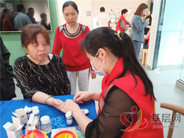医生耐心给居民测血糖