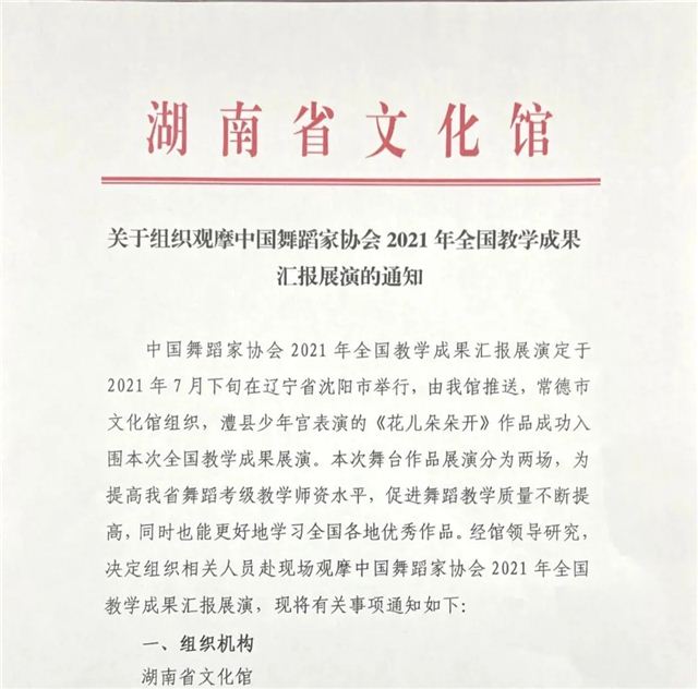 7月9日,常德市澧县少年宫接湖南省文化馆通知,由该宫选送的少儿舞蹈《花儿朵朵开》,7月25日将代表湖南省赴沈阳参加2021年全国艺术教学成果汇报展演。