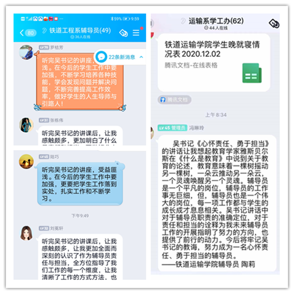 “辅导员工作就是于细微处见责任,这是我这次培训最大的体会!”在培训课结束的这两天里,高铁职院的辅导员们线上线下依然在热烈讨论着,交流着培训心得。学校的官网、官微,各二级学院的辅导员工作群,关于吴伟生书记这次别开生面的辅导员面对面培训一时成为大家热议的焦点。不少辅导员开始期待,下一次书记上课是什么时候呢。吴书记以他更高的政治视野、广博的人文知识和全身心关爱学生的师德风范,为全体辅导员作出了立德树人的表率。