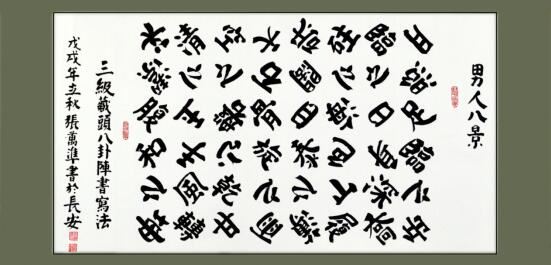 张万准把《易经》读了6遍以后有了创作的灵感,打破了几千年来书法的书写格式,创作之初只是简单的一级八卦,后来一直演练到八级八卦,在创作中张万准把一些传统文化的经典文字等贯穿书于八卦之中,随着不断的提升,八卦书法也成为一种新型书法不断完善并获得中华人民共国家专利证书,成为中国藏头八卦阵书法的创始人,做到了在书法中游历传统文化,在文化中学习八卦变化,真正把书法和传统文化以及函数的奥妙结合了起来。
