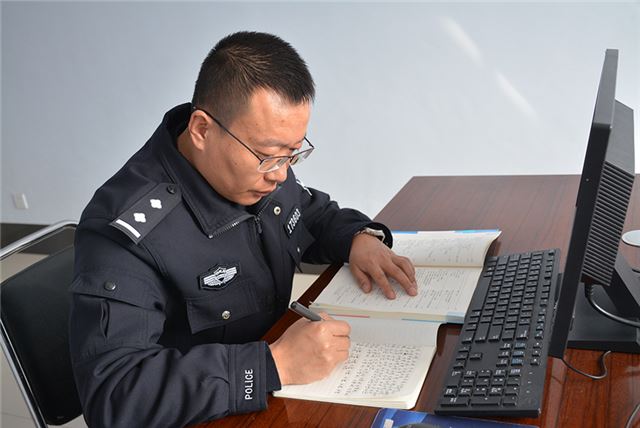 面对新的工作要求与挑战,之前掌握的知识还是远远不足的,他对他带过的兵说:“现在我们都是一个起跑线了,我可不能跑你们后面去,你们也要小心别被我落得太远了”,为了更快的成为一名合格的移民管理警察,一名优秀的检查员,在完成自身工作任务的同时,开始了自己的强化学习,坝上执勤时学习,抗疫路上学习,凭着自己的不懈努力,自身的业务水平直线上升,成为了站里的学习标兵;面对自己从未接触过的朝鲜语领域,曹飞并没有打退堂鼓,每天早起到楼下默读朝鲜语,兜里面时刻都揣着一个朝鲜语“小宝典”,听人说看韩剧对于语感有帮助,经常拉着同事在休息时一起看韩剧,韩剧里的动人剧情与屏幕前认真做笔记的曹飞形成了很强烈的反差萌。