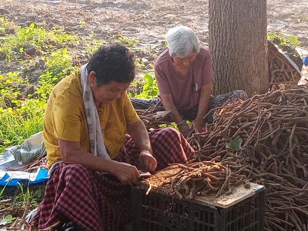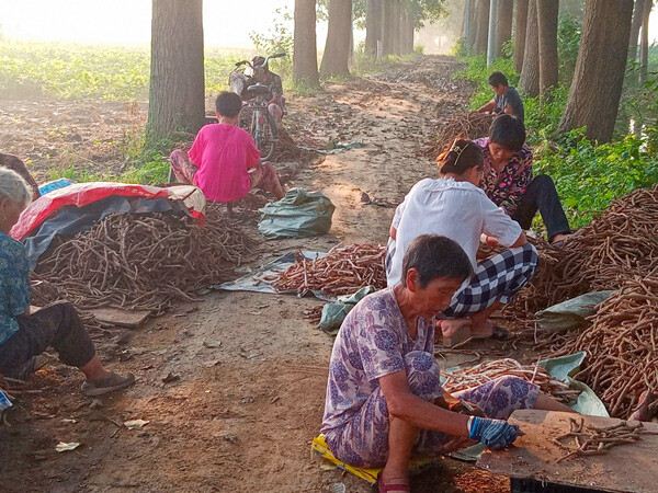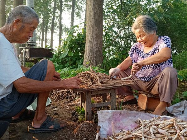 “李奶奶她的年龄有点大了,一天能挣40多块钱很不错了,你看东边那几个大婶,一天都挣120多块钱。我们按产量给她们算工钱,用刀子剐掉药材的皮,成品每市斤按6角钱计算。如果遇到个头大一点儿的药材,比较好剐的话,一天可以剐出200多斤药材。”药材货主李宗平说,“其实这个工作是个轻巧活,不怎么累人,在树荫下又不热,老少皆宜,快乐挣钱多好啊。”