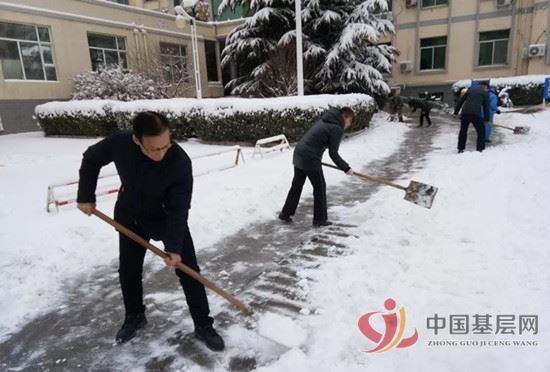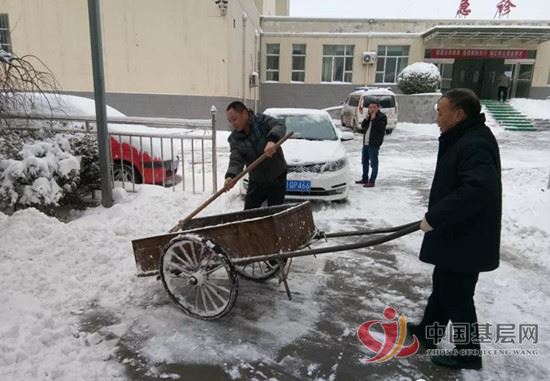 尽管天气恶劣,积雪已经冻成了厚厚的冰层,但为了患者的出行安全,大家依然冒着严寒,不怕冷不怕累,干劲十足,配合默契。有的用铲子一铲一铲地把雪铲平,有的用扫帚卖力地扫着,有的拿着大铁锹奋力地把雪往道路旁边铲,还有的推着小平车把雪往花园里运送。经过两个小时的全面清扫,厚厚的积雪被铲平,开辟出了一条条干净的大马路。