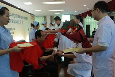 拜师仪式前,湘潭市财政局相关负责人宣读了《关于公布湘潭市首批名老中医药专家传承工作室建设项目的通知》,确定张赛等10人为湘潭市首批名老中医药专家传承工作室指导老师,李琳等30位医师为继承人。据了解,这10位名老中医,都在中医领域享有盛誉,德艺双馨。其中,姜升平是湘潭市骨伤科学术带头人,曹慎是著名老中医杨炳南先生的第四代传人。随后,名老中医身着唐装,继承人身着新医师工作服,继承人分别向各自的师傅递茶、送花,并呈上《拜师帖》。