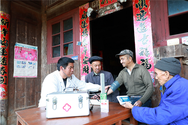 11月22日,通道侗族自治县溪口镇画笔村,该村家庭医生在上门为贫困户测量血压。今年,该县积极鼓励贫困户参与“家庭医生”签约计划,组织医务人员上门为建档立卡贫困户测量血压、血脂和心率等日常服务。截止目前,该县贫困户家庭医生签约率达100%,实现签约全覆盖。(作者:曾龙安 杨学文)