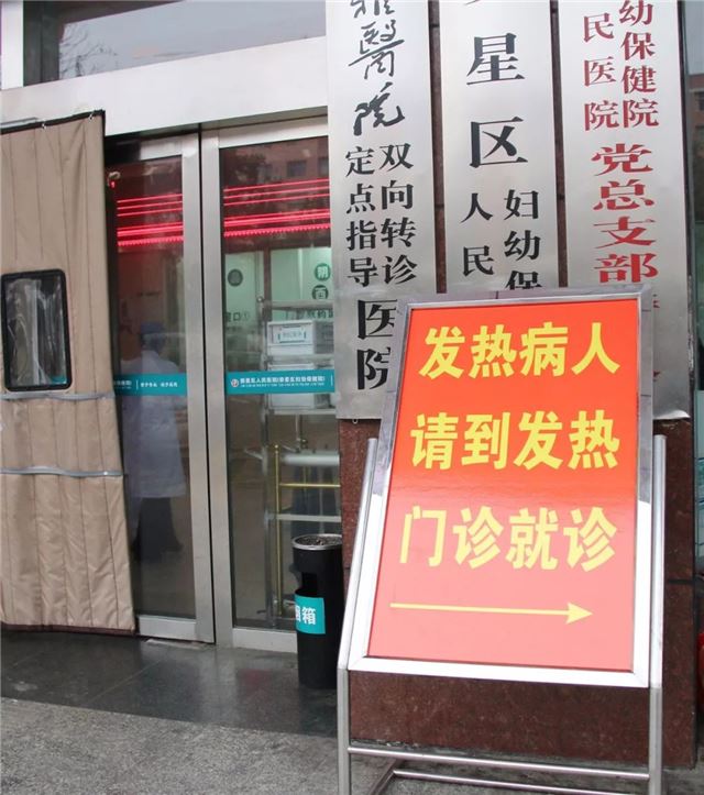 医院门急诊大楼门口、通道内,发热门诊指示牌异常醒目