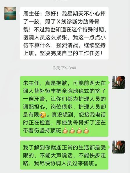 医院领导得知这个情况后,尽管朱露雯一再强调自己可以坚持工作,不用休假,但是出于对医护人员的关心与关爱,院领导在肯定了她这种无私精神之后,要求她先回家休息养伤,决不能拿自己的身体健康开玩笑。但是,朱露雯自己清楚肋骨骨裂是自限性疾病,还能够坚持,于是继续坚持向院领导请战,要求坚守岗位,为守住高铁南站入娄的第一道“关口”尽自己一份力。