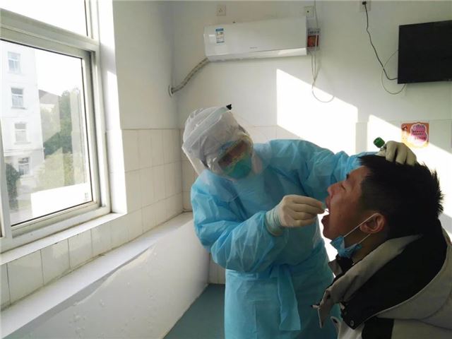 在厦门路院区为疑似病人取咽拭子
