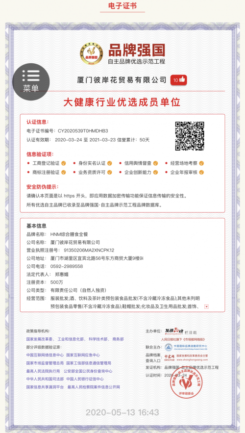 HNM经过资质审核、舆情监控等层层筛选,成功入选为品牌强国示范工程大健康行业优选成员单位,企业信息录入品牌强国示范工程数据库,在国家级平台向公众展示品牌形象。