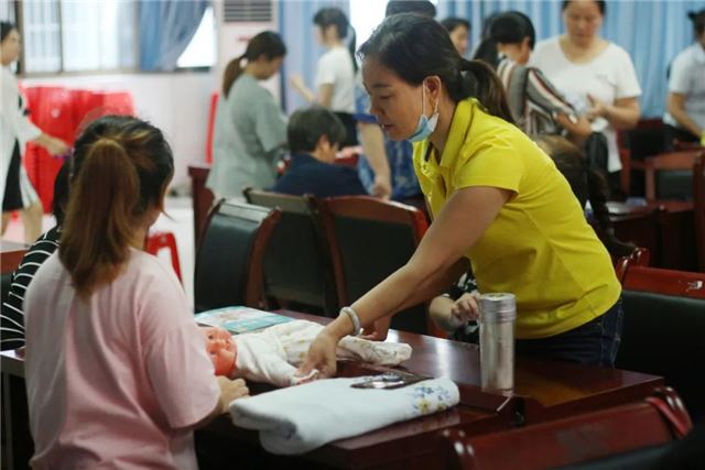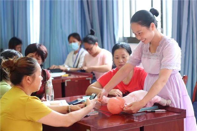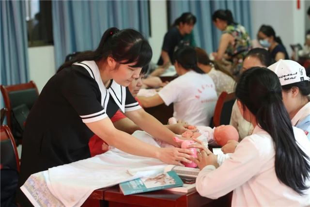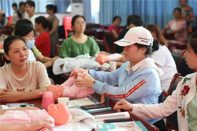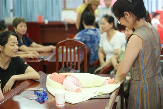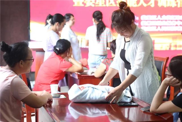 “抚触能满足新生儿被爱的需要,通过对尚无语言能力的新生儿的皮肤感受器进行温柔的抚触刺激,能使新生儿产生愉悦的心情,安静、少哭闹,有利于生长发育,提高抗病能力,促进身心健康”,实操培训老师谭妙正在讲解新生儿抚触的益处,并手把手地教学员如何进行抚触训练。学员既紧张又兴奋地对着仿真娃娃进行尝试。