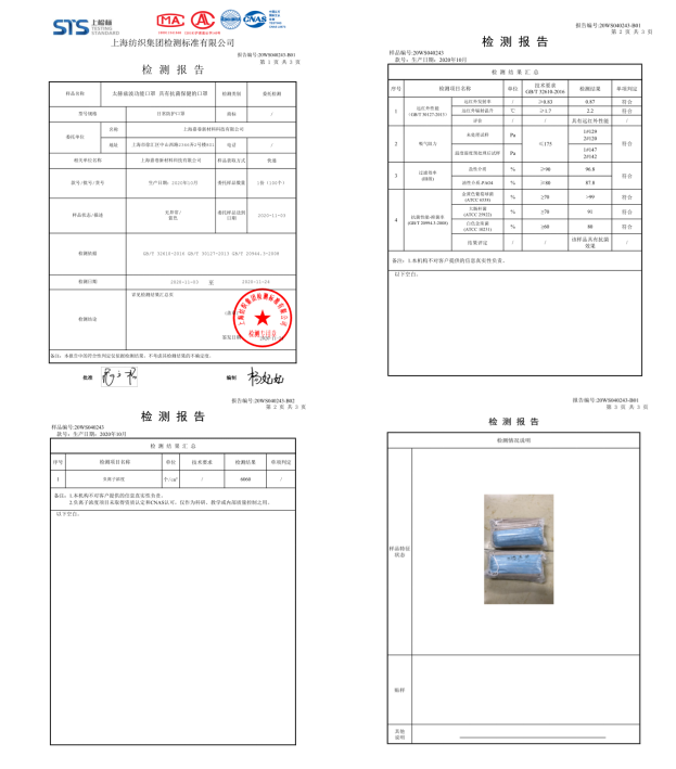 附:国家棉印染纺织质量监督中心检测上海嘉巷新材料科技有限公司的口罩结果。