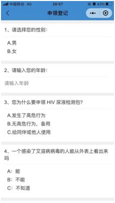陕西省疾病预防控制中心为此开发设计了“爱传递,艾检测”微信小程序,向有需求的人群免费发放艾滋病自我检测试剂,该试剂有操作简单、能够自我检测的优点,具体申领流程如下:
