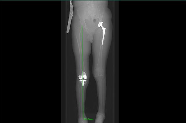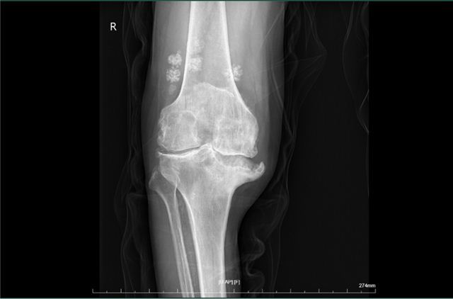 经过检查,结果提示该患者双膝重度骨关节炎,内翻畸形,内翻约20度,内侧平台塌陷约2cm。诊断很明确,双膝骨性关节炎。