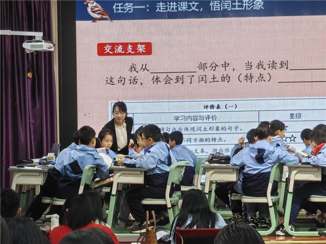 钟灵街小学团队任倩老师在本单元语文要素的统领下,以任务驱动教学,采用小组合作学习的方式,借助交流支架引导学生自主从课文中寻找体现闰土形象的句子,并感受其不同方面的特点。同时,利用评价表让生生互评,这种方式不仅培养了学生的合作探究能力和自主学习能力,还促使学生在评价他人与接受评价的过程中,更加深入地理解文本。