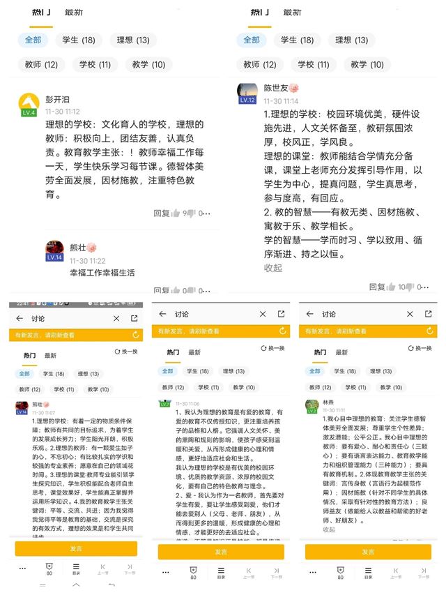在唐主任的引导下,参会人员围绕“理想的教育、理想的学校、理想的学生、理想的教师、理想的课程、理想的课堂”展开了热烈的研讨。大家各抒己见,积极讨论,从多维度深入剖析了教育相关各要素的理想状态,为与会者提供了丰富的思考和实践启示。