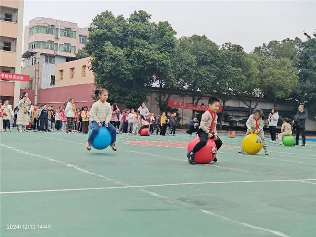 羊角球在蓝天下闪烁着五彩的光芒,与孩子们灿烂的笑容相映成趣。赛场边,加油声、欢笑声交织在一起。小伙伴们挥舞着手中的彩旗,大声呼喊着同学的名字,为他们鼓劲助威。老师们也在一旁耐心指导,眼中满是对孩子们的鼓励与关爱。