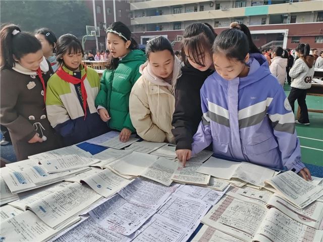 展评现场氛围热烈,同学们驻足观赏、认真研读:低年级小朋友瞪大好奇的眼睛,一边指着优秀作业轻声交流,一边默默记下值得学习的亮点,主动向大哥哥姐姐看齐;高年级同学则细致琢磨同伴作业中的巧妙思路与规范格式,不时与同学探讨交流,积极汲取他人长处。大家沉浸在浓厚的学习氛围中,互帮互学、共同进步。