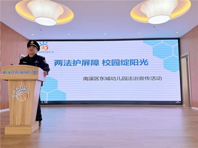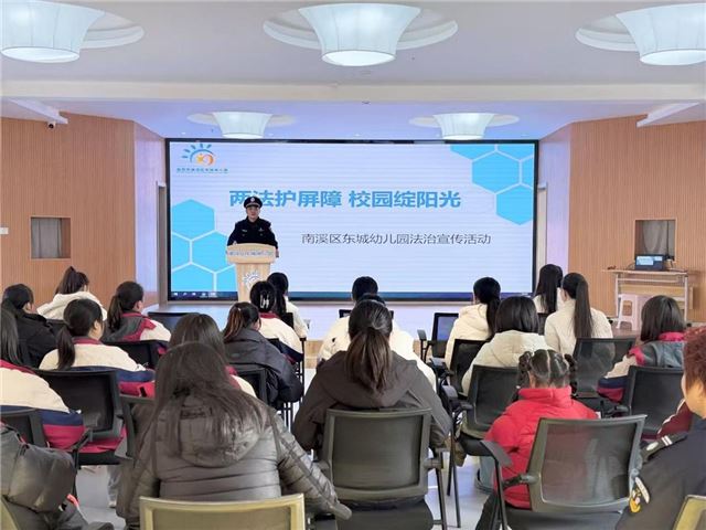 为深入贯彻落实《中华人民共和国未成年人保护法》《中华人民共和国预防未成年人犯罪法》的宣传教育要求,切实强化教职工法治素养,提升幼儿园未成年人保护与犯罪预防工作的专业化、规范化水平,为幼儿营造安全有序、法治和谐的成长环境,12月5日,南溪区东城幼儿园特邀法治副校长、宜宾市公安局南溪分局刘中来警官,开展“两法进校园”专题培训活动,全体教职工全程参与学习。