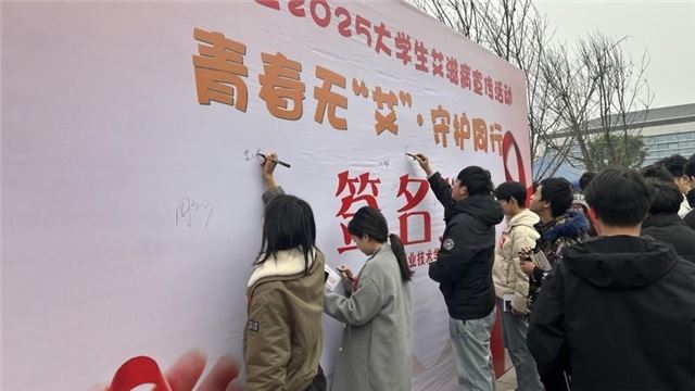 在集体倡议环节,全体同学起立,跟随主持人共同领诵《防艾倡议书》,坚定传递“科学防艾、包容关爱”的信念。随后,嘉宾与学生代表移步签名墙,依次签下姓名,以实际行动承诺践行防艾责任。签名墙核心呈现“青春无艾,守护同行”主题字样,搭配象征防艾关爱与希望的红丝带元素,设计简洁鲜明,直观传递核心信念,成为现场一道亮眼的风景线。