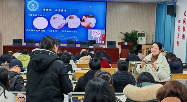 讲座伊始,关敏老师以“共约定”环节开启分享,通过幸福问卷、音乐律动、名牌卡探索、人生画布绘制、互动交流、新年心愿征集等丰富多样的形式,引导教师在沉浸式体验中释放压力、凝聚内心力量。