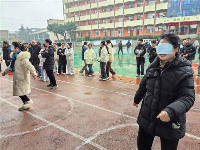 本次活动设置两大趣味项目,瞬间点燃全场热情。“电臀达人”抖球赛上,参赛教师腰系装着乒乓球的纸盒,伴着欢快节奏扭动身体,乒乓球接连掉落的瞬间,赛场爆发出阵阵笑声;蒙眼踏步圈挑战则考验大家的平衡感与专注力,蒙眼原地踏步的选手们姿态各异,引得观赛教职工纷纷加油鼓劲。两项比赛均以教研组为单位累计积分,参赛教职工全情投入,观赛人员呐喊助威,操场处处洋溢着欢乐祥和的节日氛围。