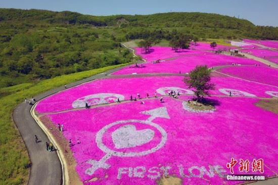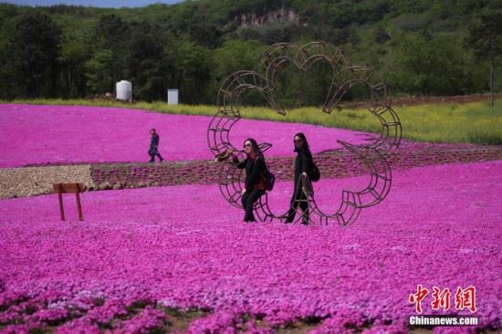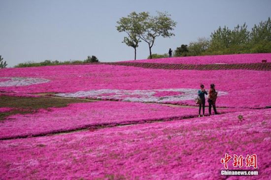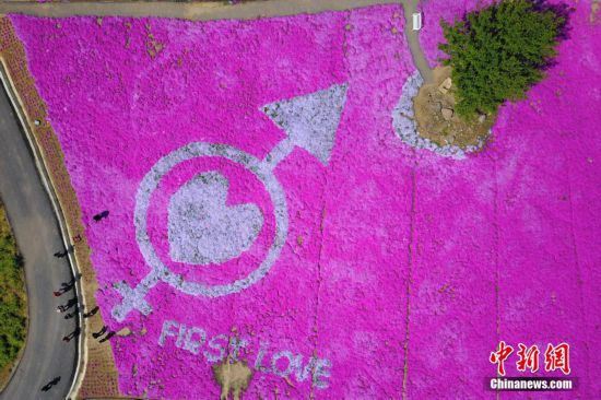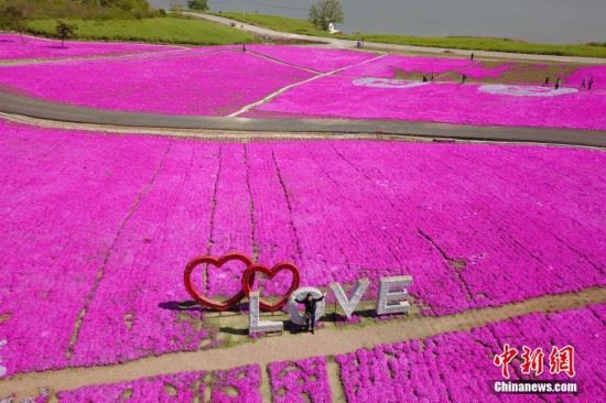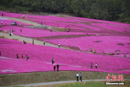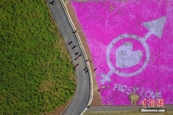 4月9日,江苏句容天王花果原乡芝樱小镇内三百亩芝樱花在春风中绽放,色彩艳丽,吸引了大批游人前来感受别样的浪漫情怀。 中新社记者 泱波 摄
