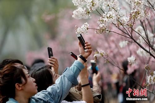 资料图:正在举办樱花节的玉渊潭公园吸引众多游客。图为游人在樱花树下拍照。中新社记者 满会乔 摄