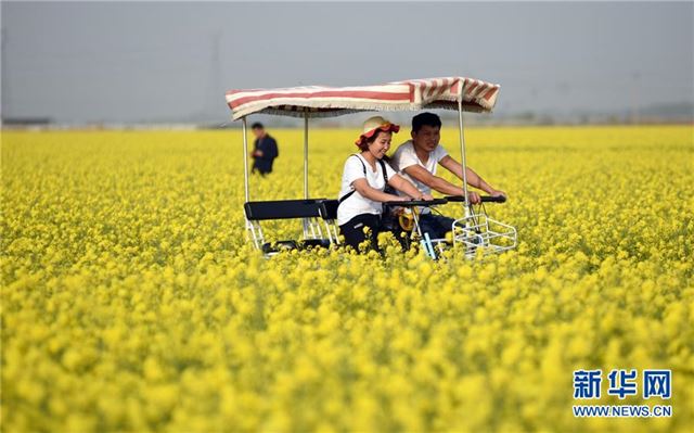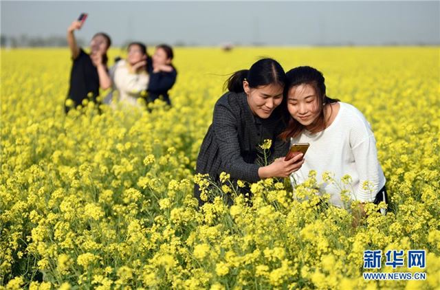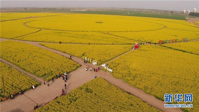近日,河北省衡水市衡湖湾大地花海3000余亩油菜花迎来盛花期,绽放的油菜花如同一片金色的海洋,吸引游人前来赏花踏青。 新华社记者朱旭东 摄