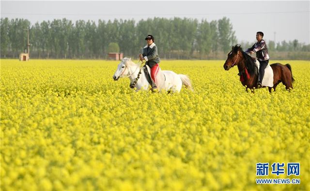 4月17日,游客在河北省衡水市衡湖湾大地花海油菜花田里骑马。