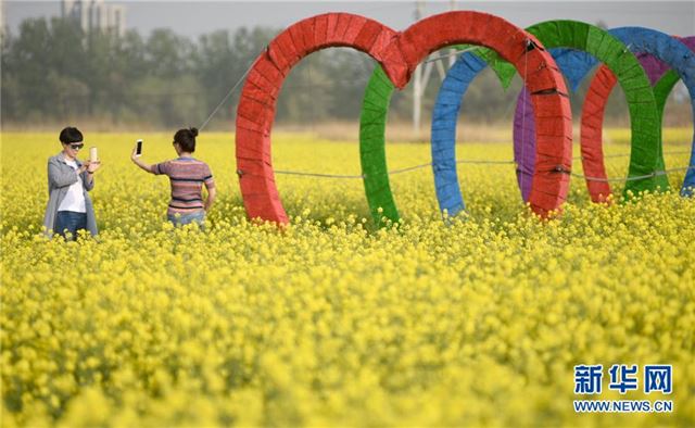 4月17日,游客在河北省衡水市衡湖湾大地花海油菜花田里拍照。
