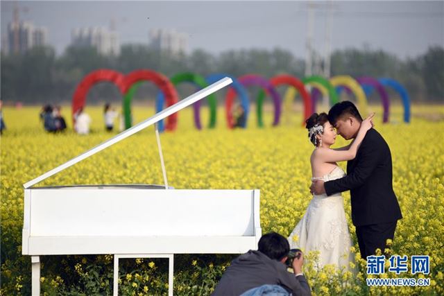 4月17日,一对新人在衡水市衡湖湾大地花海油菜花田里拍摄婚纱照。