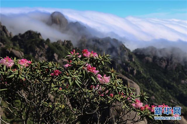 这是4月24日在安徽黄山拍摄的高山杜鹃,远处云海翻腾。 新华社发(黄辉摄)